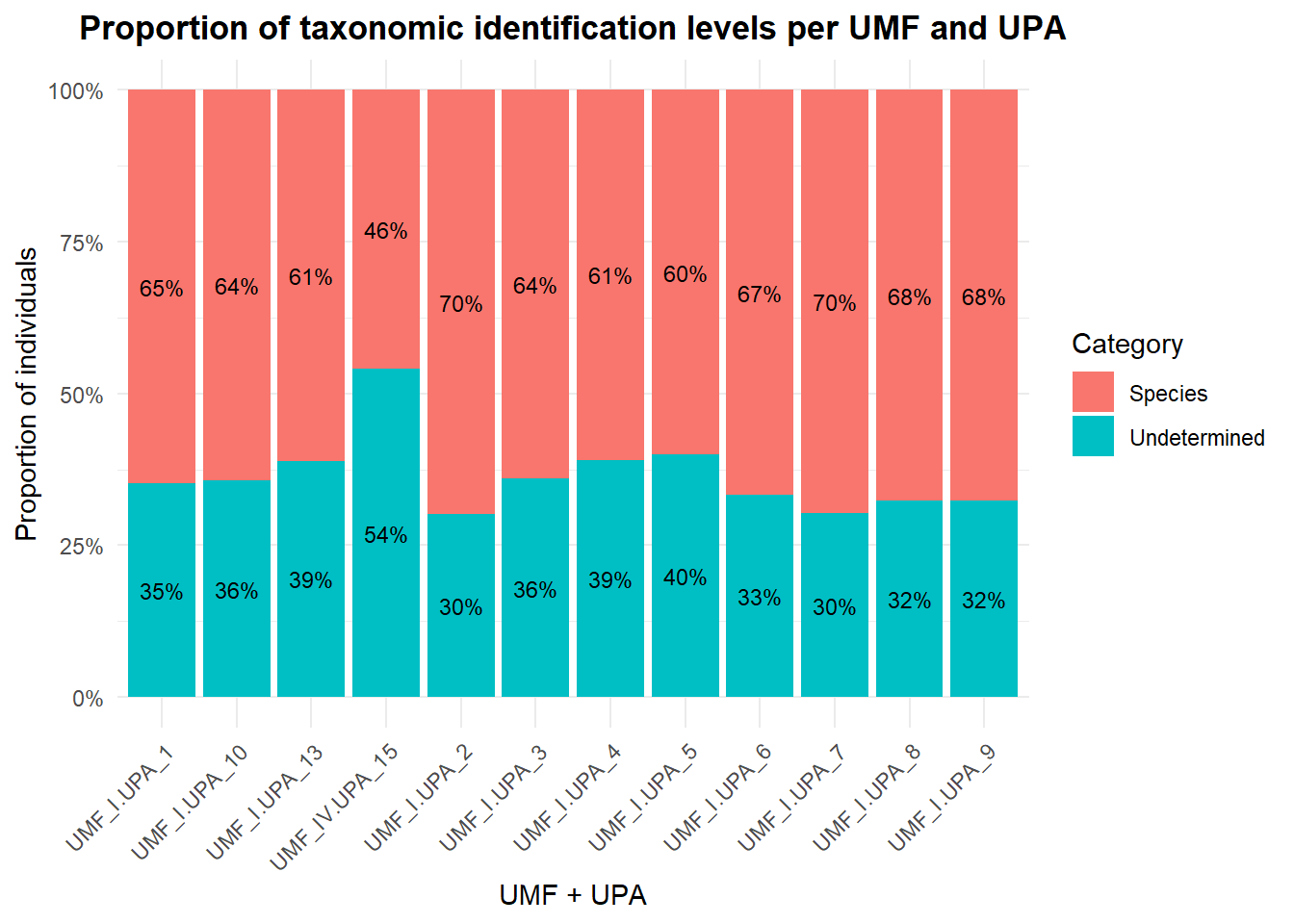 title = "Proportion of taxonomic identification levels per UMF and UPA",